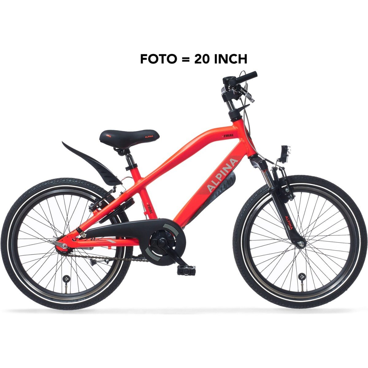 Alpina fiets Trial Jongens, 16inch. Kleur: Neon Red Matt. Uitgerust met een V-brake voor en een remnaaf achter, aluminium frame. Kleurnummmer: YS 8114 Matt.